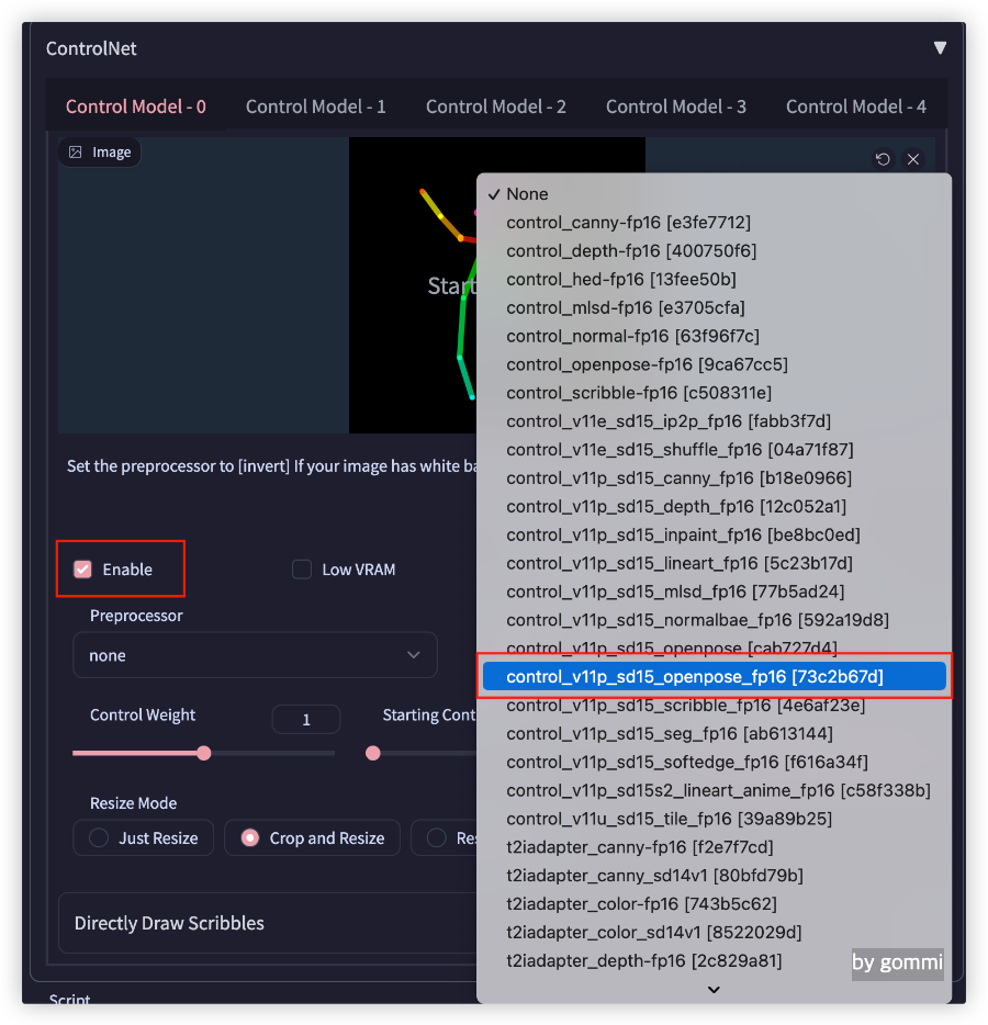 그럼 위에 만든 포즈 이미지가 txt2image 탭의 Controlnet 에 추가 되는걸 보실수 있구요.